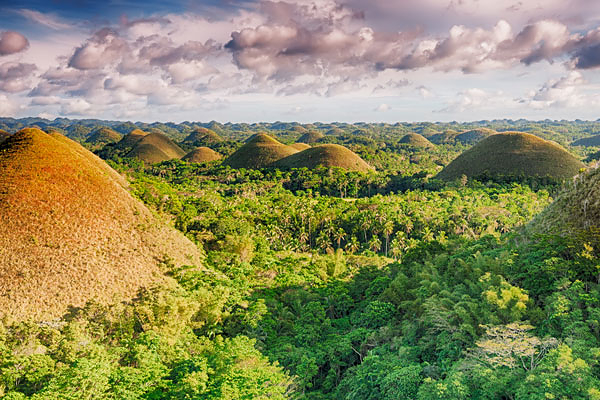 Die Chocolate Hills sind ein echter Magnet für Besucher in der beliebten Provinz Bohol. Die schier perfekt aussehenden Hügel sind in etwa in gleicher Höhe und haben Formen, die fast schon kugelartig oder kegelförmig erscheinen.Die meiste Zeit haben die Hügel eine wunderschön leuchtende grüne Farbe, da sie mit Gras bewachsen sind. In den Trockenperioden verfärbt sich das Gras allerdings braun und gibt den Hügeln Ihren Namen.
